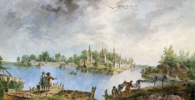Подплывая к острову Столобный (где располагается монастырь), подспудно (из памяти) возникает образ пушкинского лубочного острова Буяна, а оплывая его – последовательно меняются монастырские виды…