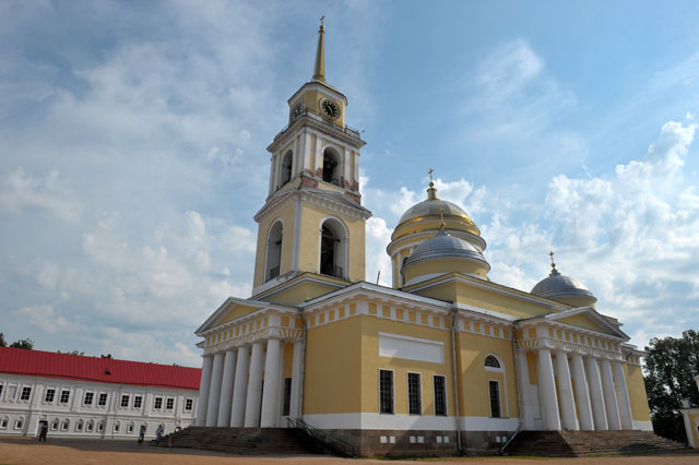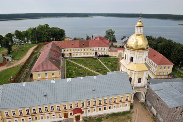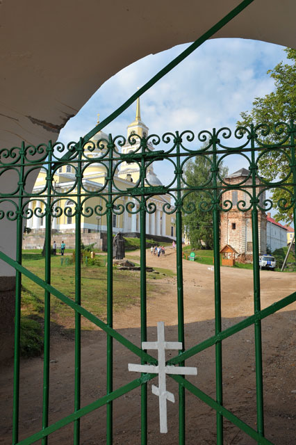 Особо выразительный вид на собор открывается от ворот обители (Светлицкой башни), рядом к которым (при входе) в 2000 году был установлен памятник Нилу Столобенскому.