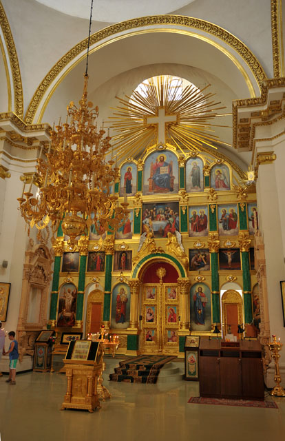 Собор имеет три престола: главный (центральный) – во имя Богоявления Господня, с правой стороны – во имя Благовещения Пресвятой Богородицы, с левой стороны – во имя Святителя Николая Чудотворца, а его внутреннее убранство отличается особым величием.
