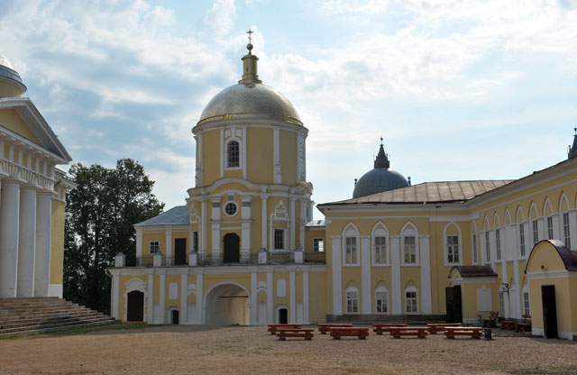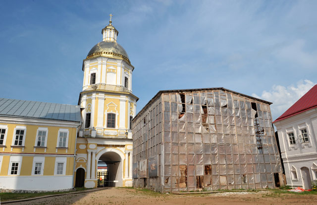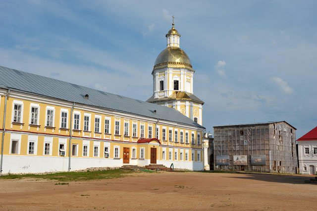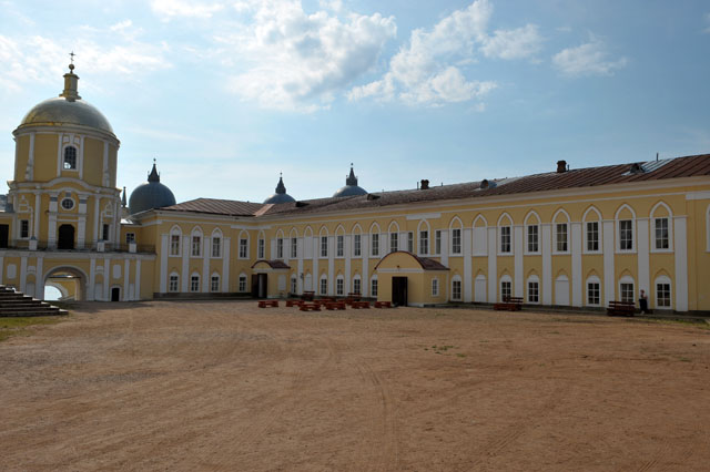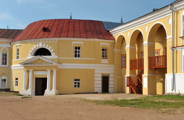 – с западный стороны, примыкающий к корпусу бывший казначейский и настоятельский корпус (1792-1794), где ныне располагается новая монастырская трапезная, а также на втором этаже (в части помещений) – размещен монастырский музей, где развернута галерея старых икон местных иконописцев, а также можно ознакомиться с историей самой обители (стоимость билета – 100 руб.);