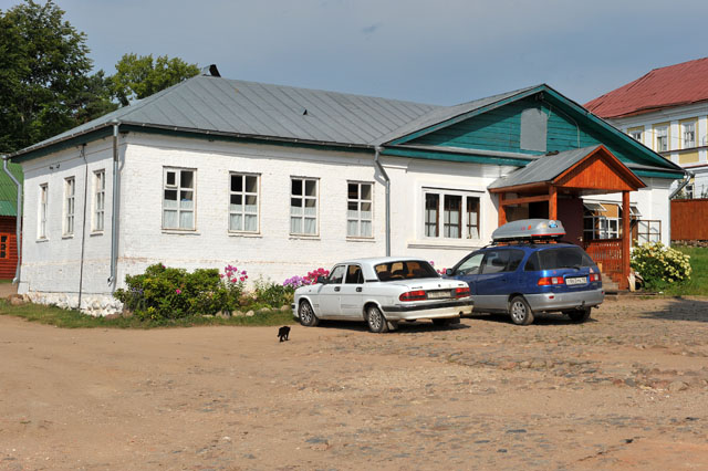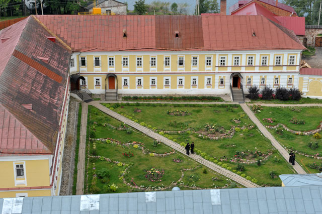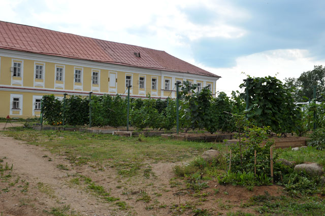 а за ними – жилое здание, где, очевидно, проживают трудники, приезжающие в монастырь для работ и духовного окормления.