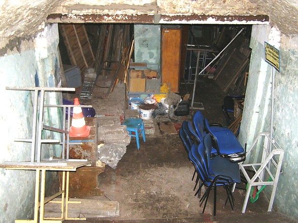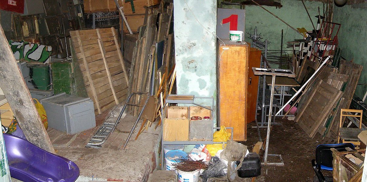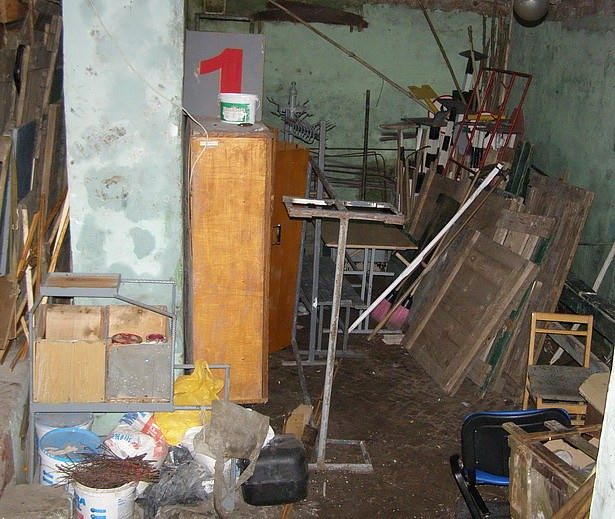 Вторая же часть помещения, где вы сейчас видите шкаф, на котором табличка с красной цифрой 1, и всякий хлам навален - вешалки, столы, щиты какие-то, там была мастерская. Где сейчас стоит шкаф, там стоял верстак вдоль стены, на нем были прикручены добротные тиски, на стенах аккуратно висели различные инструменты... Насколько я помню, в далекие семидесятые-восьмидесятые стены не были оштукатурены, как сейчас, были просто побелены. В общем, был порядок. А еще там были парочка столов и стулья. Но все это имущество было настолько органично вписано в дизайн каптерки-мастерской, что никакие предметы мебели не вызывали ни малейшего подозрения в их неправильном использовании.