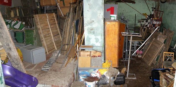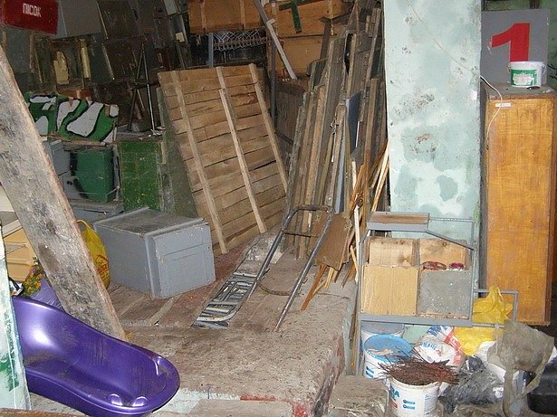 Раньше, я думаю, в этом погребе было овощехранилище, потому как в нем есть две бетонные ванны, очевидно, для засолки. В наше время Ваня приспособил эти ванны для хранения лопат и метел - проложил широкие доски вдоль с расстоянием между ними в 5-8 см, и в эти щели аккуратно помещались метлы и лопаты черенками вглубь этих резервуаров. Очень грамотное использование пространства. Сегодня эти ямы заполнены каким-то имуществом, похожим на спинки кроватей, а сверху какое-то барахло навалено.